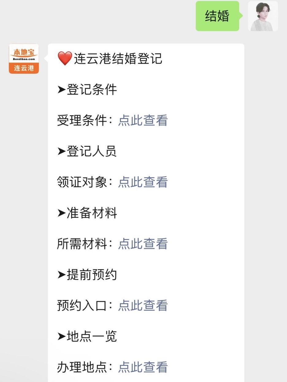 温馨提示:微信搜索公众号【连云港本地宝】,关注后在对话框回复【结婚】,可获:连云港结婚登记指南,包括:受理条件、所需材料、预约入口(含520)、办理地点/电话、以及证件补办等。